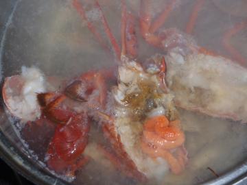 これは半分に割ったのを酒と塩をいれた湯のなかへ入れただけの状態で、もちろんコノママ白い身の部分を食しても美味ですが、このだし汁はこの状態で味噌汁に、または高温でボイルし甲羅も細かく砕き、十分ダシがでるまでボイルした後、殻を漉し、生クリームや野菜を加えポタージュに、または更にほかの魚介類を加えブイヤベースはいかがでしょうか。おもわず、涎がでてきます。 やはり伊勢海老、さすが伊勢海老です。