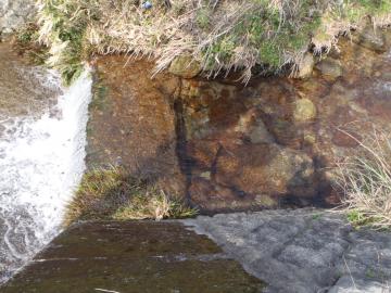 これはメダカ池に注ぐ水で、山の湧水にホースを置いただけの源泉たれ流し状態で、幸せなメダカたちです。