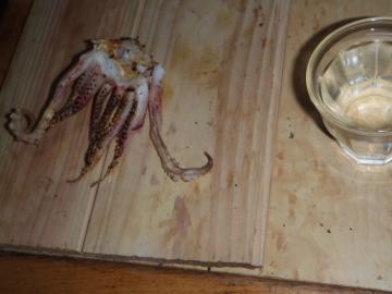 酒、とくに日本酒好きには、これを見ただけで酒が飲みたくなるのではないでしょうか。 日本酒の肴の代表選手、イカとナマコです。 イカはここで揚ったのを一夜干しにしていたものを炙っただけで、さすが鮮度がいいので、このするめイカは炙ると身が膨れてきて、甘味が増します。 塩辛はおなじイカをスミも入れ、すべて刻みこみ、少量の酒と塩でまぜただけで、日に日に味に深みがでてきます。