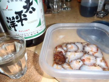 ナマコは生きたままを半分に切りますと、内臓が出てきますので、生のコノワタを包丁の背でしごき、そのまま口のなかへ直行させ、日本酒で流しこみます。 それから、おもむろに、二つに割つた身の部分を刻んで食べるだけです。 イカと同じで鮮度がよいので、素材そのものの味もよいので、調味料、塩、醤油、酢などなしで食べた方がいいです。 ただ、日本酒だけは必須です、ワインやウイスキー、ビールや焼酎ではこの肴の繊細な味をこわします。 上の日本酒はこの地、新宮の地酒で、ネーミングがいいですね「太平洋」とは壮大な大きさと世界への広がりを感じさせます。 地のものは地の酒が最も相性がいいです、そして、そのままが・・・