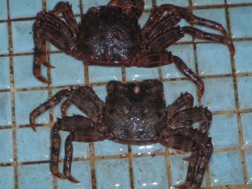 シヨウジンガニがと呼ばれる甲羅の大きさが5〜6cmぐらいの小さな蟹で、海老網に掛かっていたものを漁師さんにいただいたものです。 この蟹は小さいわりに力が強く、硬く、海老網を破るので、海老獲り漁師さんには嫌われ者です。
